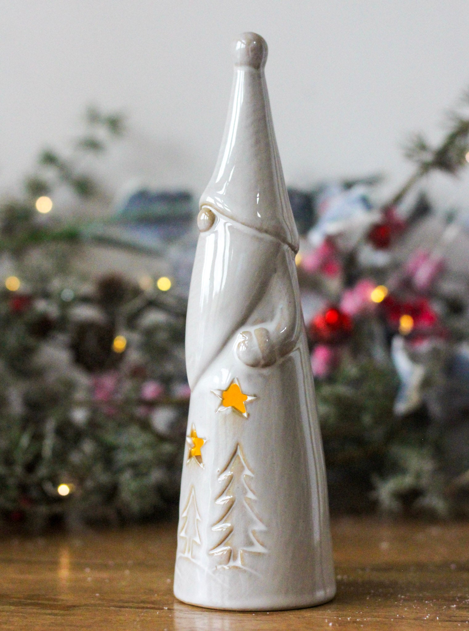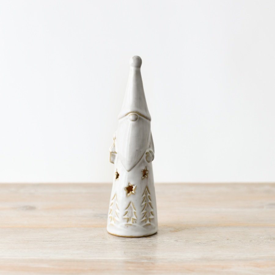 This charming stoneware Santa ornament glows warmly with LED light shining through delicate cut-out stars and embossed trees. Finished in a soft natural glaze, it adds a cozy, festive touch wherever you place it. Simply flip the switch at the bottom to light up the magic—batteries are included for instant holiday cheer. Perfect for creating a cute, fun atmosphere this season!