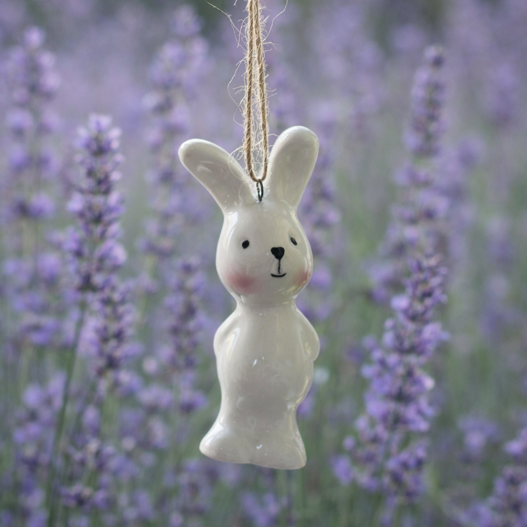 This adorable little ceramic bunny is perfect for hanging from your Easter tree, with blushing rosy cheeks and a natural string attached for easy hanging.Perfect for an Easter tree!