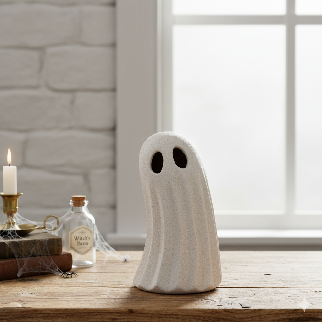 This large stoneware ghost figurine is simply spooktacular! Super sturdy, he stands tall and proud with a cut out underneath, meaning you can simply light a tea light or battery operated light underneath for a stunningly eerie glow.