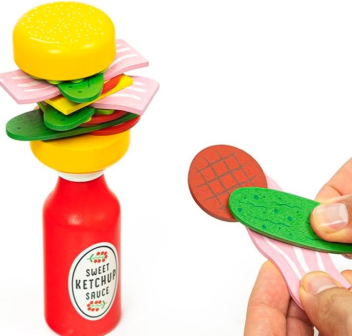 Players take turns to roll the dice to determine what burger ingredients they have to try and balance on top of the ketchup bottle. Beware, though! As the pile gets bigger … and bigger … and bigger, one wrong move can topple the tower and you become the loser!